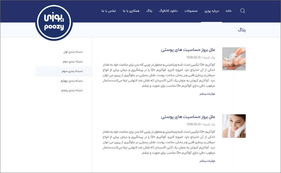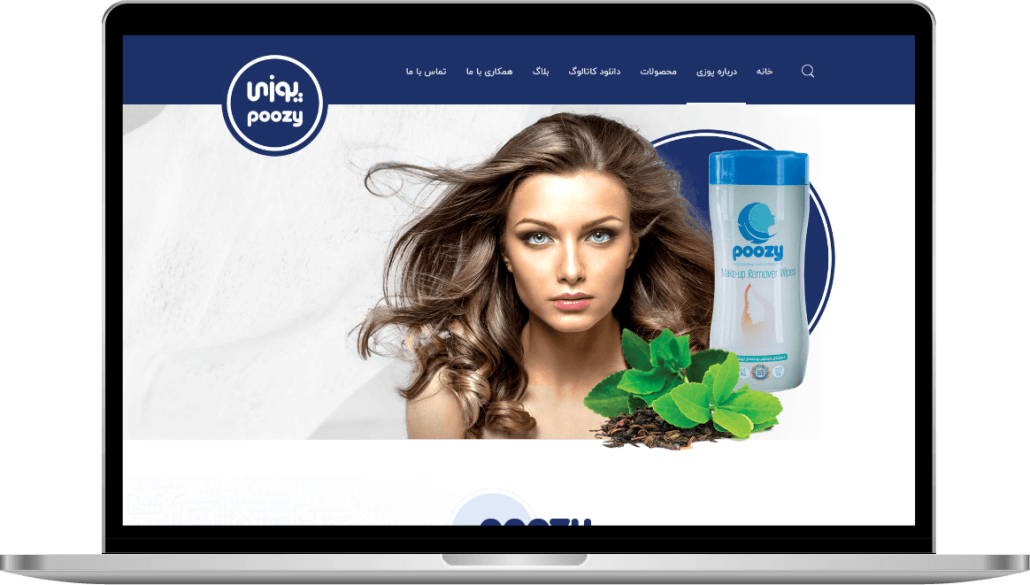 The Poozy.co website was developed for Erfan Tak Azar Company in 2019, specializing in showcasing cosmetic and cellulose products. The website is designed to display two main product categories: cosmetics and children’s products, all made with organic ingredients and high-quality lotions produced by the company.